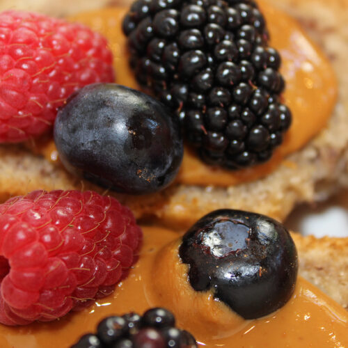 • 2 Scheiben saftiges Bananenbrot mit cremigem Erdnussmus